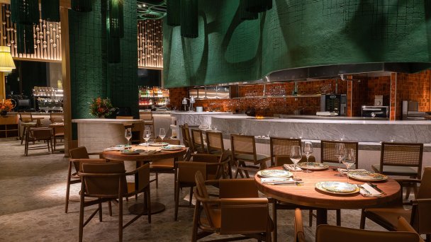 Мария Соколова с командой дизайн-бюро Lichno создали пространство, где паназиатская кухня и культура обрели свое архитектурное воплощение. Зал ресторана с посадкой в 70 мест привлекает обилием оттенков зеленого: за панорамными окнами — канаты, изумрудные стены, по рельефу которых будто стекает вода, лианы, перегородки, напоминающие потрескавшиеся скалы, и элементы живой природы, эффектно вписанные в интерьер.