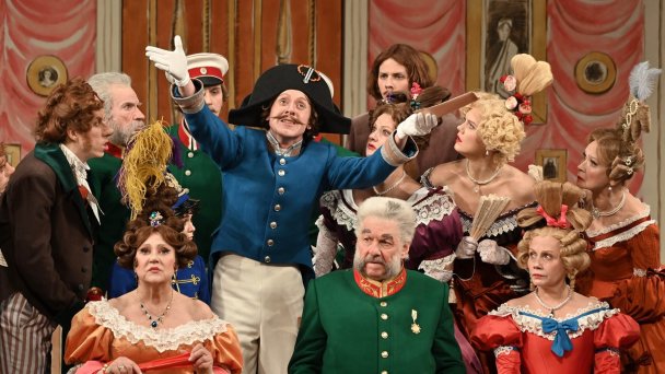 Переломным моментом становится, конечно, появление Хлестакова. Тихон Жизневский, чью узнаваемую внешность гримеры не стали менять, ограничившись только париком со слегка растрепавшейся модной завивкой, играет в темпе presto и по ходу действия постоянно мимикрирует, оборачиваясь то эдаким душкой-премьером императорской сцены, любующимся собой в роли Хлестакова, то вполне современным типажом жулика-неврастеника, занимающегося разводкой наивных провинциалов.