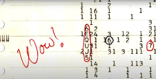 Именно так рассуждали астрономы из университета Огайо. В 1973–1997 гг. они сканировали небо с помощью радиотелескопа с романтичным названием «Большое ухо». Исследователи искали на длине волны 21 см узкополосный сигнал, слишком сильный для естественного излучения водорода. И однажды нашли. Сотрудник, проверявший запись за 15 августа 1977 года, написал на бумажной регистрационной ленте: «Вау!» (англ. Wow!). Это восклицание со временем стало чуть ли не официальным названием загадочного сигнала.