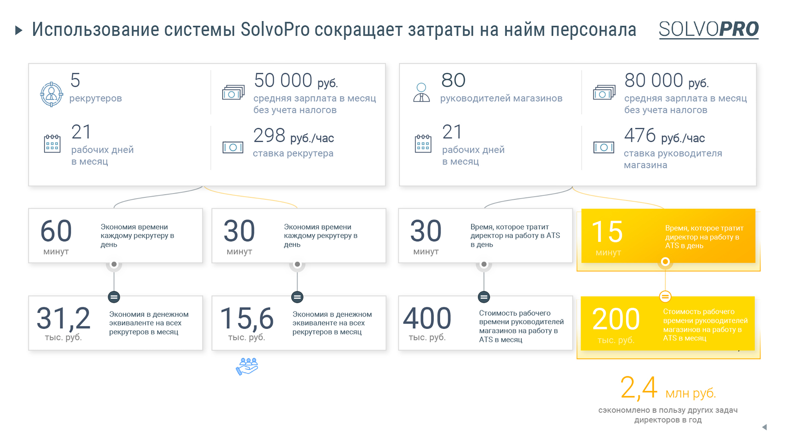 Система SolvoPro позволяет директорам подразделений тратить меньше времени на заполнение потребности в кадрах, предоставление обратной связи по кандидатам, позволяет сосредоточиться на основных бизнес-задачах своего подразделения, и также на обучении и адаптации новых сотрудников. В свою очередь компания может существенно сократить издержки за счет отключения неэффективных источников, анализа «узких мест» в воронке или основных причин отказов.